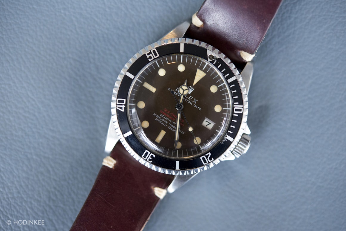 Questo è un altro mega orologio di lunga data dalla collezione di Matt. Molti sanno che un doppio Red Sea-Dweller è uno dei primi versione da collezione della prima Rolex con una valvola per la fuoriuscita dell'elio. Ma lo sapevate che la stessa prima della partita in realtà hanno un fondello con la scritta "(Patent Pending)"? Yup, questo orologio è stato fatto prima che il brevetto è stato concesso a Rolex, e per di più, Matt ha una splendida quadrante marrone scuro. Non vedrete un attesa di brevetto, tropicale, doppio-Red Sea-Dweller molto spesso.